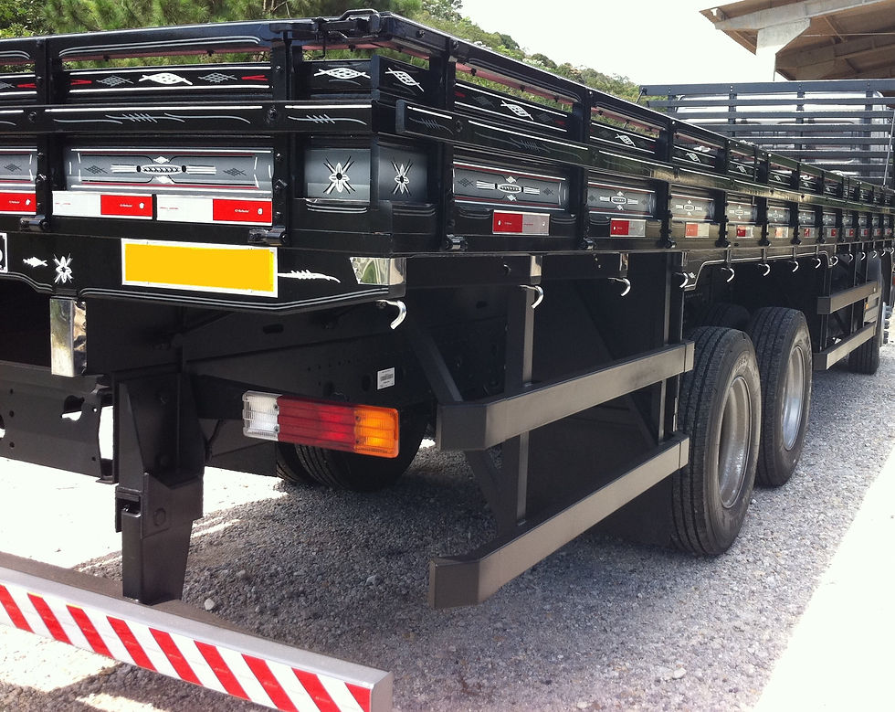 Base: Fabricada em madeiras de grande resistência, recebendo estirantes em chapa 1/4 e chapeamento entre as longarinas e barrotes, proporcionando maior vida útil.